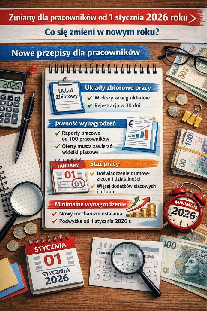 Nowy rok 2026 zapowiada się jako czas istotnych zmian na rynku pracy. Choć część regulacji oznacza nowe obowiązki dla pracodawców, dla pracowników są to przede wszystkim rozwiązania wzmacniające ich pozycję, prawa i bezpieczeństwo socjalne. Warto już teraz zapoznać się z nowymi przepisami i śledzić ich wdrażanie w zakładach pracy, zwłaszcza tam, gdzie istotną rolę odgrywają układy zbiorowe i dialog społeczny.